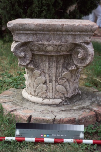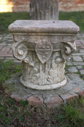capitello pseudocomposito decorato su una delle facce sotto l'abaco con uno stemma a scudo troncato con sei stelle.