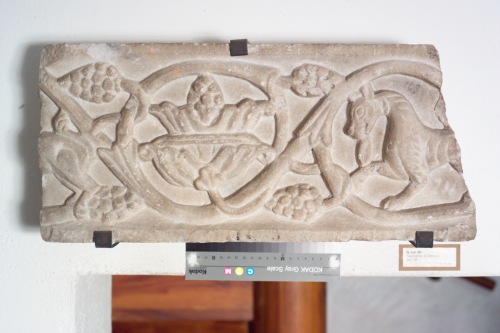 Frammento di fregio marcapiano decorato con motivo a tralcio abitato. Il tralcio del tipo semplice sinusoidale con diramazioni a ventaglietto presenta desinenze a grappolo, i peduncoli avvolgono il tralcio principale e riempiono gli spazi di risulta triangolare con andamenti divergenti e convergenti antinaturalistici. Negli spazi circolari (uno solo completo e due frammentari ai lati) definiti dal tralcio sono collocati due animali (uno conservato solo nella parte posteriore, l'altro pur frammentario riconoscibile come canide/lupo), e un fiorone a doppio calice con grappolo terminale eretto.