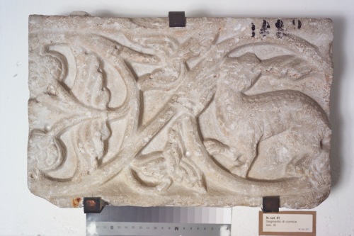 Frammento di fregio marcapiano decorato con motivo a tralcio abitato. Il tralcio presenta desinenze secondarie a tre lobi con nervature fitte, assimilabili a esemplari tipici della plastica contariniana. Il punto di diramazione Ë semplificato al massimo. Sono presenti solo due motivi di riempimento rispettando l'usuale alternanaza di elementi zoomorfi e fitomorfi: da un peduncolo germinano due fogliette a cime degradanti e due piccoli melograni divergenti ai lati di una foglietta dello stesso tipo; nel clipeo affiancato un leprotto con il muso rivolto all'indietro si ciba di una foglia.