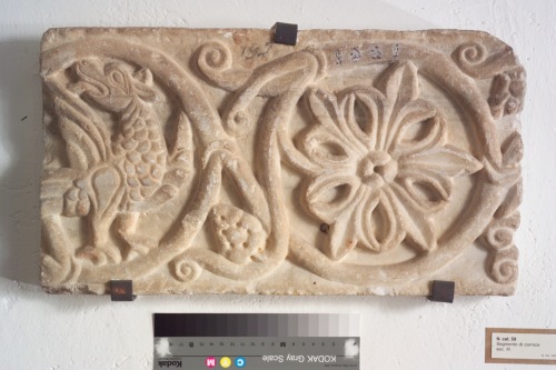 Frammento di fregio marcapiano decorato con motivo a tralcio abitato. Il tralcio, del tipo a listello semplice arrotondato, presenta andamento sinusoidale e complessità di derivazioni. Il tralcio secondario si suddivide a sua volta sovrapponendosi al tralcio principale e germinando caulicoli e grappoli. Il motivo di riempimento vegetale fiorisce dallo stesso tralcio con sottile peduncolo e presenta petali gigliacei e bottone centrale con foro. Il campo precedente Ë occupato da un grifo alato dalle membra rilevate, il piumaggio e il capo (rivolto all'indietro) resi da solchi incisi.