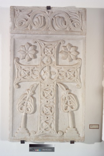 Pluteo suddiviso in due campi. In quello principale campeggia una croce ad estremità patenti percorsa all'interno da un tralcio a girali riempiti ognuno da una foglia a quattro pedali e solcatura centrale profonda (croce - albero della vita). Al centro dei bracci si vede la mano benedicente di Dio accompagnata dai simboli del sole e della luna. Ai lati della croce in basso lo spazio Ë occupato da due cipressi piegati verso la croce; in alto a destra e a sinistra lo spazio di risulta Ë invece occupato da due stelle. Su una fascia superiore corrono due tralci speculari con foglie dai lobi tondeggianti.