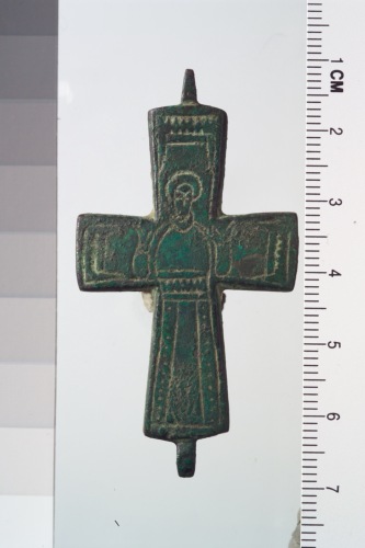 valva anteriore di croce-reliquiario metallica a bracci espansi, di tipo latino, con raffigurazione incisa di santo in atteggiamento di orante.