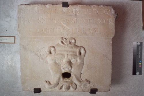 Lastra con mascherone dalla bocca aperta e iscrizione.