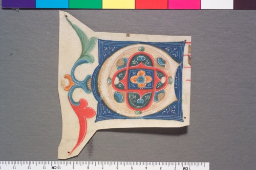 Iniziale ritagliata da un corale. Sul fronte tracce di tetragramma e di notazione quadrata; iniziale C (?) (non Ë stato possibile ricostruire il testo cui l'iniziale era posta a capo), su campo esterno blu decorato a biacca, di colore rosa pallido; nel campo interno, di colore rosa, due racemi rossi formano due ovali intrecciati, arricchiti, all'interno, da fiori e foglie su fondo blu e, all'esterno, da quattro foglie rotondeggianti; dal corpo della lettera si diparte un fregio costituito da racemo verde terminante in due foglie verdi e rosse con nervature a biacca. A tergo tracce di tetragramma e notazione quadrata. Una riga di testo solo in parte leggibile.