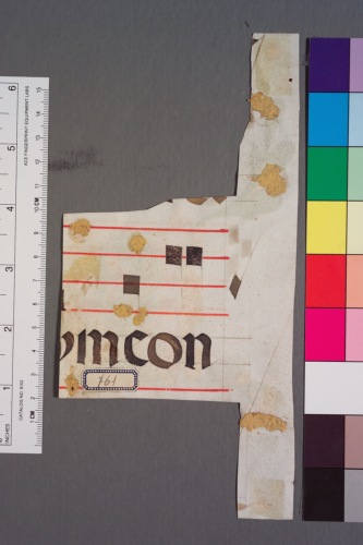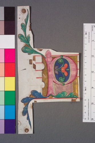 Iniziale ritagliata da un corale. Sul fronte tracce di tetragramma e di notazione quadrata; iniziale P (non Ë stato possibile ricostruire il testo cui l'iniziale era posta a capo), su campo esterno in lamina d'ora profilato di nero, di colore rosa con decorazione a biacca; nel campo interno a fondo blu, un fiore e racemi con foglie in rosso e verde. Dal corpo della lettera si dipartono due brevi fregi fogliacei verdi e blu arricchiti da bottoni dorati. A tergo tracce di tetragramma e notazione quadrata. Una sola riga di testo solo in parte leggibile.