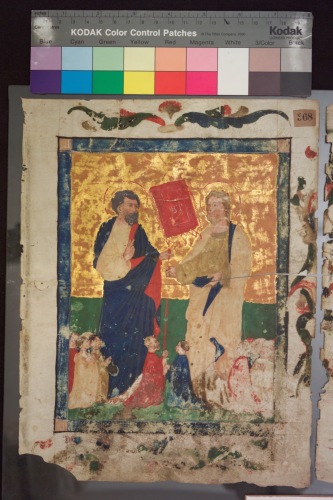 - NOTIZIE STORICO CRITICHE Si tratta evidentemente di un foglio staccato da una mariegola di una confraternita veneziana che aveva come protettore San Marco, patrono di Venezia, e un altro santo, forse S. Tommaso in relazione delle lettere S T iscritte nello stendardo. San Marco Ë riconoscibile per l'inconfondibile volto con i capelli e barba scuri, mentre l'altro santo, dai lineamenti giovanili manca di connotazione e attributi specifici. La realizzazione deve condursi ad ambiente veneziano dei primi decenni del Quattrocento come indicano il naturalismo e il linearismo tardo gotico delle figure. Pi˘ specificamente il confronto si può fare con la pittura di Nicolò di Pietro e Zanino di Pietro mentre in miniatura, il punto di riferimento Ë Cristoforo Cortese di cui la nostra miniatura non raggiunge il marcato espressionismo e del quale comunque ricorda soprattutto il momento del foglio staccato da mariegola (New York, The Metropolitan Museum of Art, Robert Lehman Collection 1975.I.2468) e del foglio con la Madonna della Misericordia della Coll. Wildenstain (Parigi, Musee Marmottan) per entrambi dei quali Ë stata proposta una datazione all'inizio del secondo quarto del Quattrocento. Non si può proporre una datazione molto avanzata per la tipologia dell'acanto del fregio che ha ancora una struttura di tardo trecento.