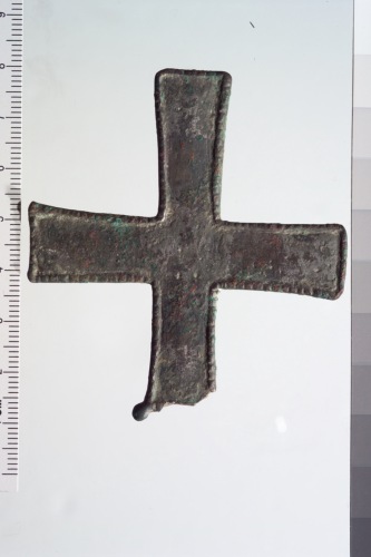 Croce metallica di tipo greco a braccia lievemente espanse, con traccia di anello di sospensione e decorazione a pallini incisi lungo i profili dei bracci.