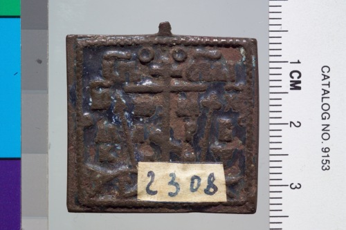 icona metallica portatile. Medaglia quadrangolare in bronzo con figure a rilievo su smalto azzurro e lavorata sulle due facce: sul recto L'icona della Vergine Hodegetria venerata da due santi. Sul verso vi sono simboli della Passione sul monte Calvario. Restano tracce del pendaglio.