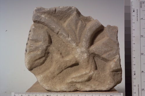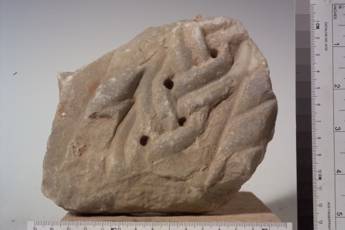 frammento di fregio lavorato su due facce: su un lato rimane una decorazione a tralcio e listello tondo con riempitivi fitomorfici, nell'altro lato un motivo a treccia con fori di trapano a sottolineare gli incroci, tra due cordonature.