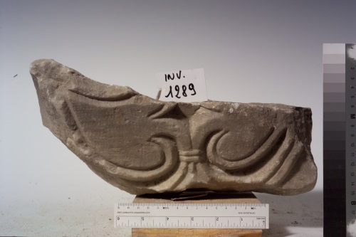 il frammento scultoreo presenta due tralci monosolcati formanti una voluta e terminanti in due foglie d'edera solcate lungo i bordi e divergenti.