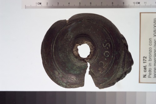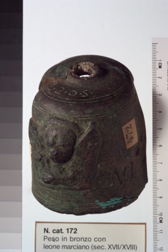 Peso in bronzo con leone marciano a moleca e iscrizione.
