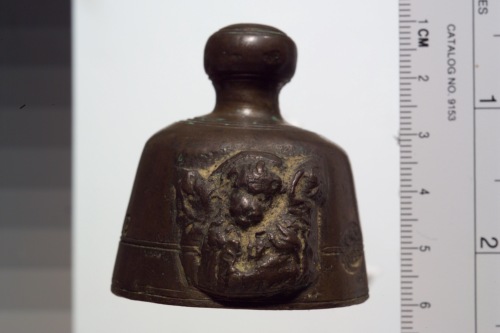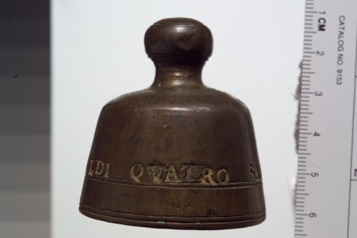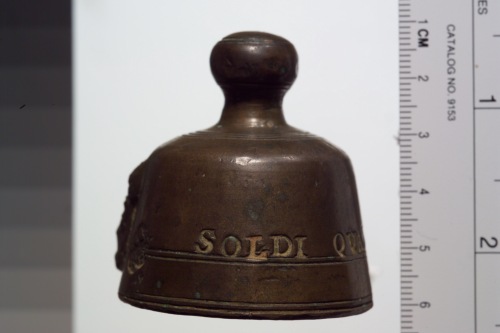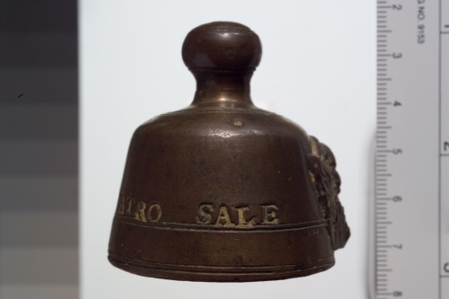 peso campaniforme in bronzo con decorazione a rilievo: leone marciano a moleca e iscrizione.