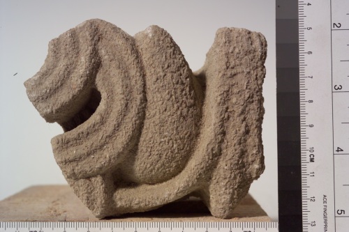 frammento lapideo in cui da un lato è presente un nastro bisulcato rettilineo che in corrispondenza della frattura sembra arcuarsi attorno ad un elemento ovoidale. A fianco di questo altri due nastri bisulcati e arcuati si incontrano. Tra di essi è presente un traforo.