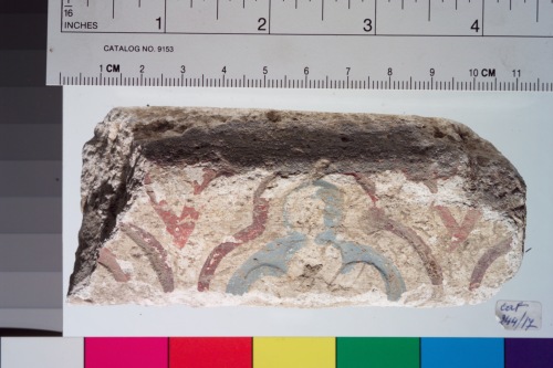 Frammento di decorazione in stucco con tracce di decorazione geometrica policroma centrata su di un motivo polilobato parzialmente conservato; azzurro, rosso e rosso-bruno su fondo bianco.