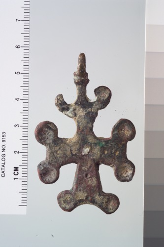 croce-encolpio metallica di tipo latino con bracci espansi terminati ciascuno con due dischetti apicali concavi.