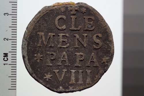 bolla di Clemente VIII.Sul recto le teste dei santi Pietro e Paolo, ciascuna aureolata da un arco di globetti che si uniscono a quelli del contorno,separate da una croce astile.