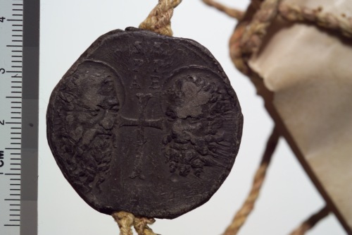 due bolle di Paolo V Papa. Sul recto le teste dei santi Pietro e Paolo, ciascuna aureolata da un arco di globetti che si uniscono a quelli del contorno, separate da una croce a stile. Sul verso sono presenti due aquile dalle ali spiegate.