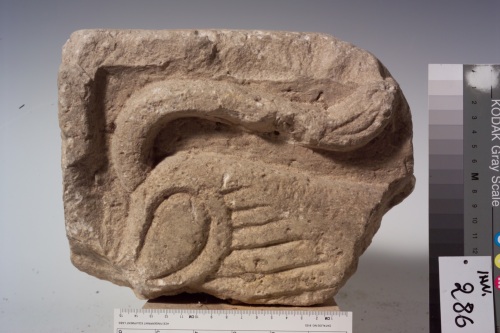 frammento di formella rettangolare decorata a bassorilievo con un quadrupede di cui resta solo una porzione di zampa posteriore e la coda.