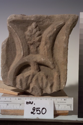 base estrema di braccio di croce di pietra, a terminazione espansa, decorato da un motivo a tralcio.