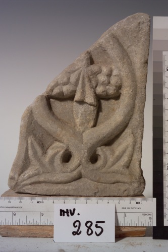estremità di un braccio di croce in marmo decorata con motivo a tralcio inabitato.