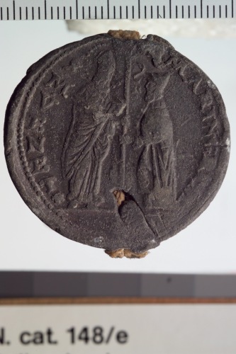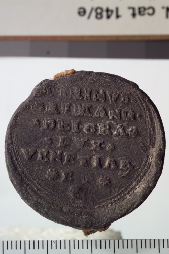 bolla di forma circolare del doge Marino Grimani. Reca sul recto San Marco, a sinistra, regge con la destre un vessillo mentre il doge, a destre, reso di profilo e pi˘ piccolo a santo, regge l'asta del vessillo con la sinistra.