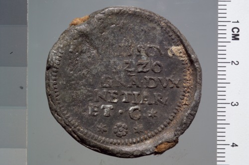 bolla plumbea del doge Francesco Erizzo. Reca sul recto San Marco, a sinistra, regge con la destra un vessillo mentre il doge, a destra, reso di profilo e più piccolo del santo, regge l'asta del vessillo con la sinistra.