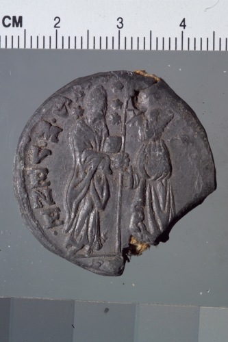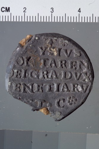 bolla plumbea del doge Alvise Contarini. Reca sul recto San Marco, a sinistra, regge con la destra un vessillo mentre il doge, a destra, reso di profilo e pi˘ piccolo del santo, regge l'asta del vessillo con la sinistra.