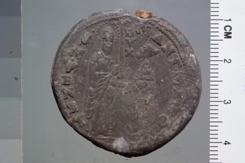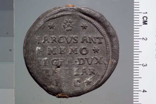 bolla plumbea del doge Marcantonio Memmo. Reca sul recto San Marco, a sinistra, regge con la destra un vessillo mentre il doge, a destra, reso di profilo e pi˘ piccolo del santo, regge l'asta del vessillo con la sinistra.