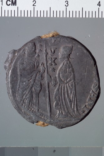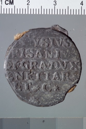 bolla plumbea del doge Alvise Pisani. Reca sul recto San Marco, a sinistra, regge con la destra un vessillo mentre il doge, a destra, reso di profilo e più piccolo del santo, regge l'asta del vessillo con la sinistra.