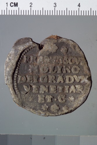 bolla plumbea del doge Francesco Molin Reca sul recto San Marco, a sinistra, regge con la destra un vessillo mentre il doge, a destra, reso di profilo e più piccolo del santo, regge l'asta del vessillo con la sinistra.