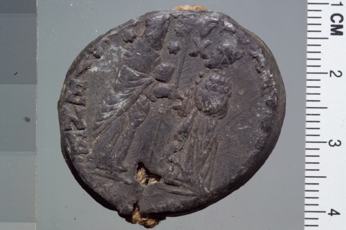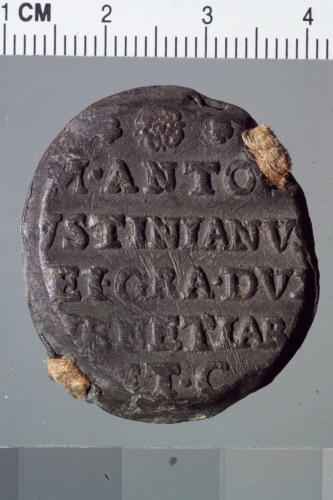 bolla plumbea del doge Marcantonio Giustinian. Reca sul recto San Marco, a sinistra, regge con la destra un vessillo mentre il doge, a destra, reso di profilo e più piccolo del santo, regge l'asta del vessillo con la sinistra.