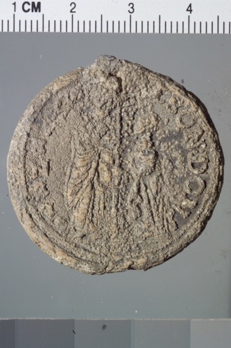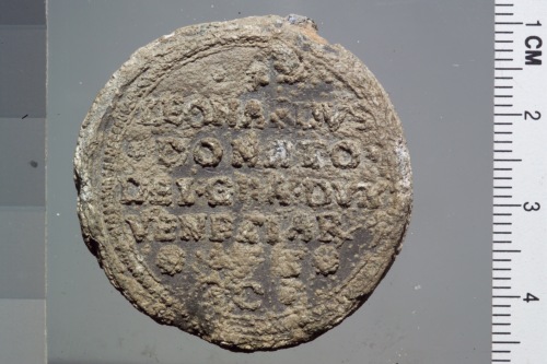 bolla plumbea del doge Leonardo Donà. Reca sul recto San Marco, a sinistra, regge con la destra un vessillo mentre il doge, a destra, reso di profilo e pi˘ piccolo del santo, regge l'asta del vessillo con la sinistra.