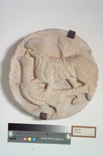 patera di forma circolare in cui un quadrupede è reso nell'atto di ghermire e beccare un uccello posto nel partito inferiore.