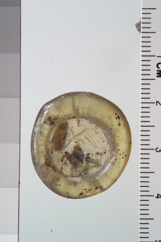 Peso monetiforme bizantino in vetro ambrato con impresso monogramma.