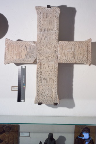 - ISCRIZIONI nei quattro braci della croce - IN CRU/CE PEC/CATUM / MUNDI/PATET / ESSE / PIATUM IN CRUCE / SPEREMUS CRUCE CRIMINA / NRA LAVEMUS - lettere capitali - a graffito - latino