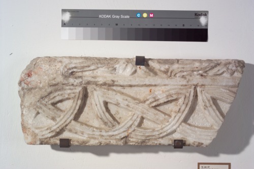 le due fasce decorative sono separate da un listello. Quella superiore è illeggibile: si intuisce solamente la presenza di un nastro bisolcato. La fascia inferiore, delimitata da una cornicetta, è caratterizzata da un nastro a tre capi che forma degli occhielli ogivali intrecciati.