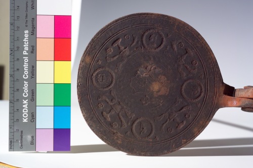 stampo a matrice circolare in ferro con lunghe braccia a tenaglia per ostie. Un lato della matrice presenta una decorazione con al centro uno stemma araldico poco leggibile tra figure stanti (angeli?) circondato da stelle. La fascia pi˘ esterna Ë decorata da quattro clipei con teste intercalati da quattro vasi (cantaros) affiancati da cornucopie e fiori. L'altro lato presenta al centro uno stemma gentilizio circondato da decorazione a ovuli (poco leggibile). Sulla fascia esterna quattro gruppi di tre angioletti intervallati da quattro cantaros e festoni di fiori e foglie.