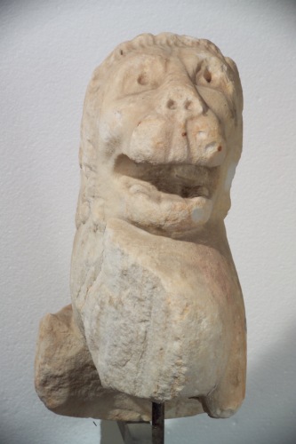 leoncino a tutto tondo accovacciato sulle zampe posteriori, con le fauci spalancate e privo delle zampe anteriori. Gli occhi e le narici sono segnati da fori, la criniera è caratterizzata da ciocche disposte a coppie con le estremità divergenti.