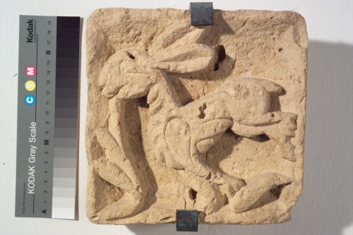 formella quadrangolare decorata con elemento zoomorfo (lepre) campeggiante sul fondo liscio e leggermente convesso verso i bordi. L animale è definito da solchi ed Ë rappresentato nellatto di mangiare una foglia composta da tre lobi digradanti desinente direttamente dallangolo della formella. Il motivo è libero, non inscritto in tralcio.