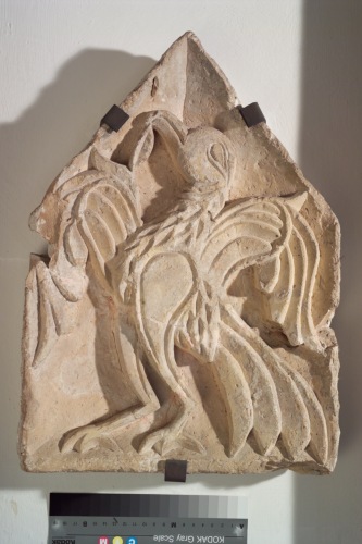 formella pentagonale di terracotta decorata a bassorilievo con unaquila(o grifone) ad ali spiegate e pativ pendente dal becco. DESS: aquila/ grifone