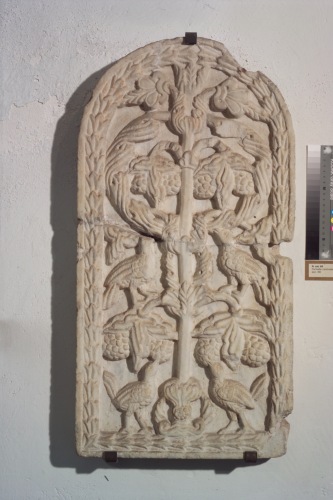 la cornice esterna è costituita da un motivo a ghirlanda di alloro, con gruppi di tre fogliette ripetute. Lo spazio centrale Ë occupato da un albero il cui tronco centrale occupa tutta laltezza, terminando in un doppio motivo di fogliette a calice e in due grandi foglie laterali polilobate. Dal tronco partono due rami per lato che terminano ciascuno in tre grandi foglie oblunghe e solcate e in due grappoli. Nella parte alta si sviluppa anche un motivo a ghirlanda ad elisse costituito da foglie trisolcate e ritorte. Due coppie di uccelli si cibano dei frutti.