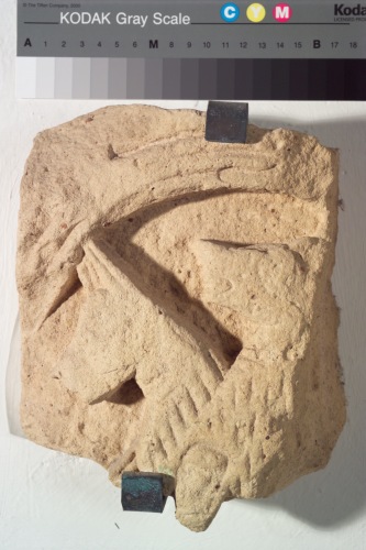 frammento di laterizio decorativo di cui Ë leggibile la curva di un elemento bisolcato interpretabile come parte di un tralcio. Nello spazio compreso nella curvatura sono presenti le parti anteriori di due canidi dalle orecchie tese ed appuntite ed il pellame sinteticamente rappresentato con solchi tratteggiati paralleli.