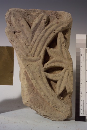 frammento di fregio orizzontale, probabilmente cornice marcapiano, decorato a tralcio abitato come si può desumere dall'elemento superstite, relativo alla diramazione, con fogliette nello spazio di risulta triangolare. Il tralcio Ë definito da solchi assimilandolo a un nastro trivimine. Si conserva una parte dell'elemento fitomorfico che campeggia nell'orbicolo a destra, le cui foglie appuntite poggiano sul cerchio definito dal tralcio.