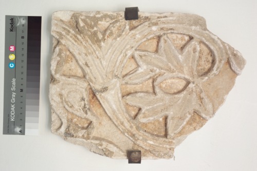 frammento di fregio orizzontale/cornice marcapiano. Presenta decorazione a tralcio abitato reso da trivimine che dopo la diramazione sottolineata da solco ortogonale si divide in desinenza secondaria arrovesciata verso l'interno (con due foglie terminali speculari le cui cime sono tangenti il cerchio disegnato dal tralcio) e tralcio principale di cui si intravede solo l'avvio. Nello spazio determinato da questo Ë presente uno zoomorfo di cui restano solo la coda e le due membra posteriori poggianti sulla punta di una foglia. Nello spazio triangolare di risulta tra le diramazioni sono collocate due foglie appuntite con solco centrale. Queste, con i solchi del tralcio determinano un motivo ad angoli inscritti.