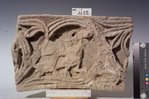 frammento di fregio orizzontale decorato con tralcio abitato. Il tralcio Ë definito da due solchi e assimilabile ad un trivimine. Pur abraso si legge compiutamente lo sviluppo del tralcio principale sinusoidale, con diramazioni principali e secondarie e foglie di riempimento appuntite con andamento opposto. Anche se frammentario si conserva un motivo di riempimento zoomorfo (colomba?).