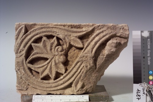 frammento di fregio orizzontale decorato con tralcio. Il tralcio Ë definito da due solchi e assimilabile ad un trivimine. Resta un solo motivo di riempimento fitomorfico