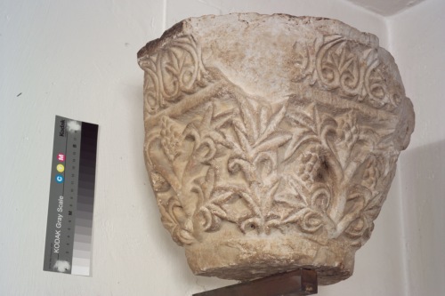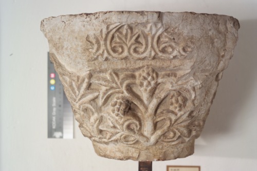 capitello cubico con collarino liscio e abaco separato da un listello con cornice a palmette a cinque e tre lobi. Al di sotto lo spazio Ë occupato da una complessa trama di alberelli di vite con tralci che riempiono tutte le aree disponibili. Dai tralci traggono origine foglie solcate e grappoli d'uva.