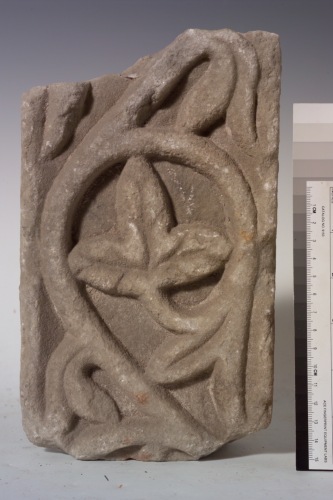fregio a rilievo decorato con un motivo a tralcio inabitato con foglia inscritta orientata orizzontalmente. Ulteriori diramazioni a foglietta ricadono con orientamento opposto all'andamento del tralcio e del riempimento.