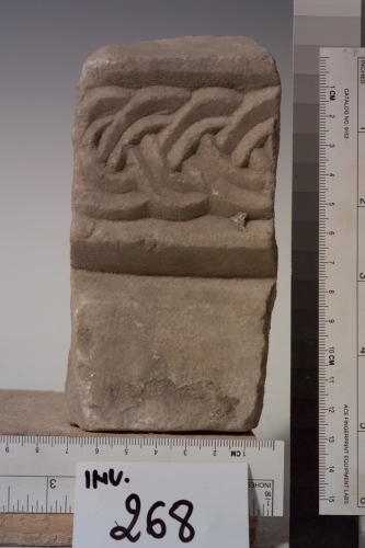 Frammento di lastra in marmo decorata con una treccia, una scanalatura a sezione triangolare, campo liscio.