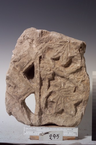 Frammento di transenna. Restano un piano decorato a rilievo con un motivo a tralcio la cui struttura fitomorfica appare naturalistica e - dopo due fori triangolari - un elemento a zig zag assimilabile a fettucce piegate a 90∞ e intersecate.